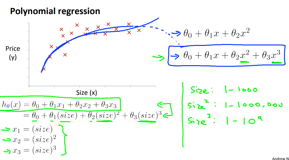 2차 함수로 $h_{\theta}(x)=\theta_0+\theta_1x_1+\theta_1x_1^2$ 표현할 수 있는데 2차 함수는 포물선 모양으로 주택가격 함수에 적절하지 않다 → 일정가격 이상에서는 주택크기에 따라 가격이 증가하는 대신 줄어들 수 있다. 따라서 1 차수가 커진 3차 항으로 표현하면 $h_{\theta}(x)=\theta_0+\theta_1x_1+\theta_1x_1^2+\theta_1x_1^3$으로 만들 수 있다.
