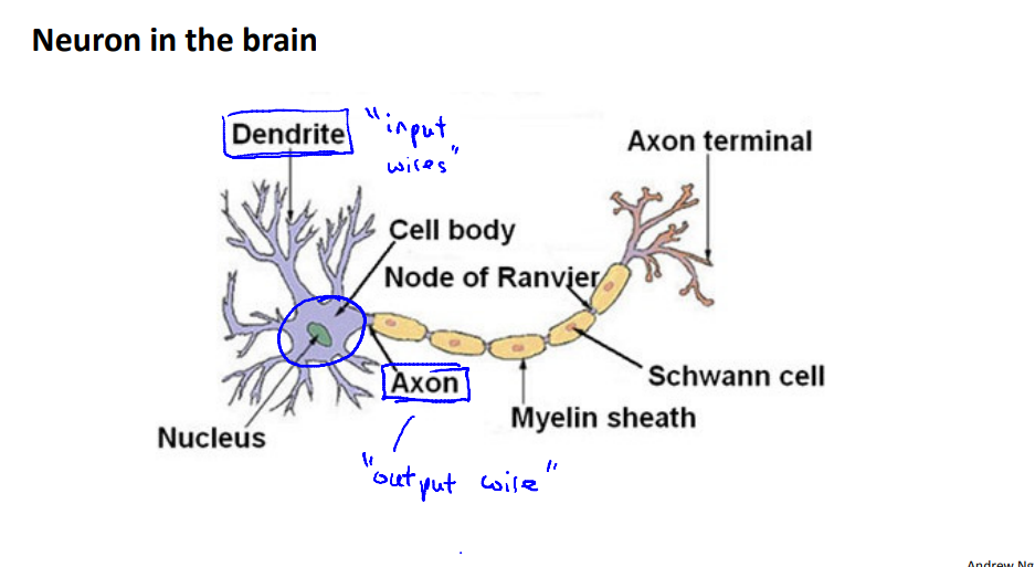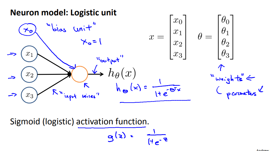 Dentrite는 input feature $x_1, x_2.. x_n$이고 ouput은 hypothesis function읠 결과이다. 모델에서 $x_0$는 bias unit으로 항상 1의 값을 갖는다. Neural network은 logistic function $\frac {1}{1+e^{-\theta^Tx}}$ 을 사용하는데 이를 sigmoid activation function이라고 일컽는다. 또한 $\theta$는 weight라고 부른다.