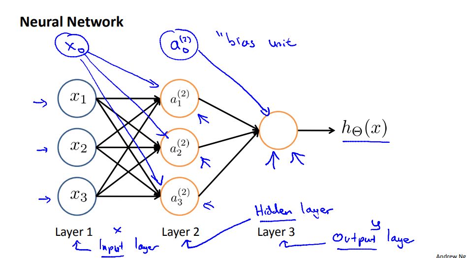 입력노드는 input layer이고 hypothesis funtion을 통해 ouput이 계산되는 이를 output layer라고 한다. 그리고 그 사이에 있는 노드는 hidden layer라고 한다. Hidden layer node의 $a_0^2... a_n^2$을 activation unit이라고 부른다.
