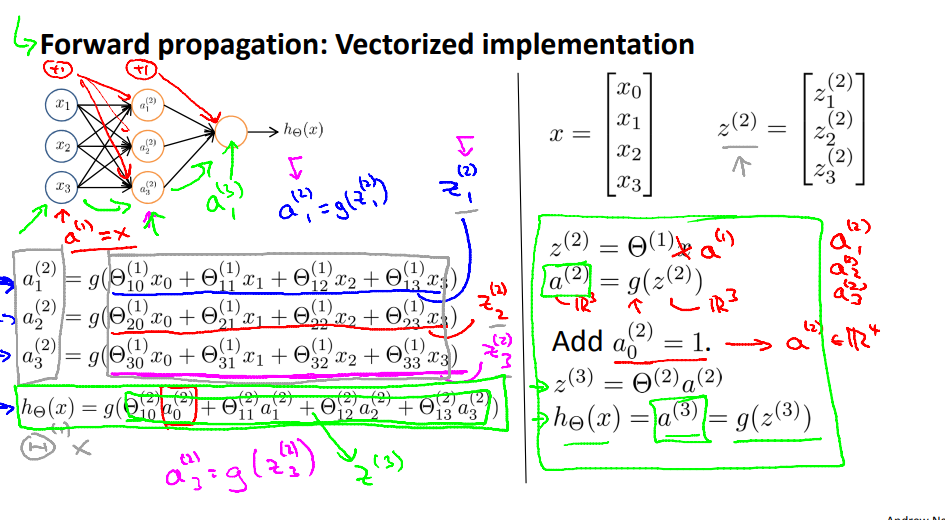 $$ \begin {align*} a_1^{(2)} = g(\Theta_{10}^{(1)}x_0 + \Theta_{11}^{(1)}x_1 + \Theta_{12}^{(1)}x_2 + \Theta_{13}^{(1)}x_3) \newline a_2^{(2)} = g(\Theta_{20}^{(1)}x_0 + \Theta_{21}^{(1)}x_1 + \Theta_{22}^{(1)}x_2 + \Theta_{23}^{(1)}x_3) \newline a_3^{(2)} = g(\Theta_{30}^{(1)}x_0 + \Theta_{31}^{(1)}x_1 + \Theta_{32}^{(1)}x_2 + \Theta_{33}^{(1)}x_3) \newline h_\Theta(x) = a_1^{(3)} = g(\Theta_{10}^{(2)}a_0^{(2)} + \Theta_{11}^{(2)}a_1^{(2)} + \Theta_{12}^{(2)}a_2^{(2)} + \Theta_{13}^{(2)}a_3^{(2)}) \newline \end {align*} $$