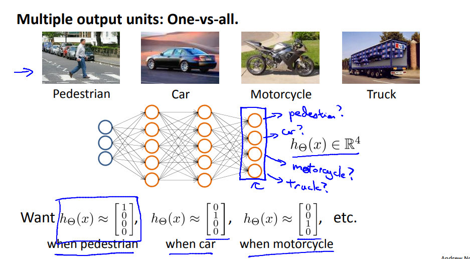 multiclass classification 의 경우 $y\in \{1, 2, 3, 4\}$가 아닌 $hΘ(x)=[0010]$의 형태로 나타내어진다.