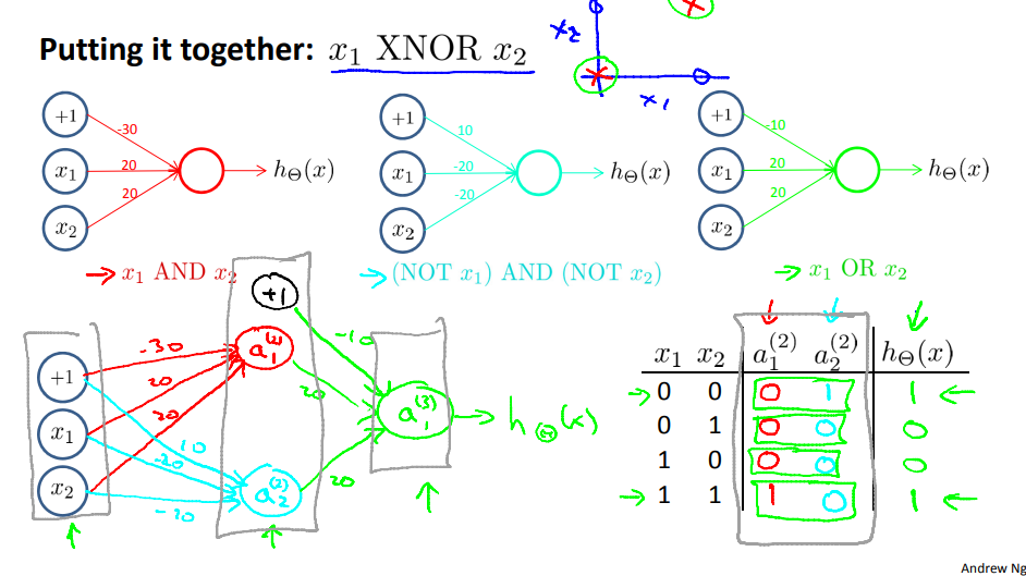$$ \begin{align*}& h_\Theta(x) = g(10 - 20x_1 -20x_2) \newline \newline & x_1 = 0 \ \ and \ \ x_2 = 0 \ \ then \ \ g(10) \approx 1 \newline & x_1 = 0 \ \ and \ \ x_2 = 1 \ \ then \ \ g(-10) \approx 0 \newline & x_1 = 1 \ \ and \ \ x_2 = 0 \ \ then \ \ g(-10) \approx 0 \newline & x_1 = 1 \ \ and \ \ x_2 = 1 \ \ then \ \ g(-30) \approx 0\end {align*} $$