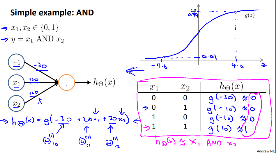$$ \begin{align*}& h_\Theta(x) = g(-30 + 20x_1 + 20x_2) \newline \newline & x_1 = 0 \ \ and \ \ x_2 = 0 \ \ then \ \ g(-30) \approx 0 \newline & x_1 = 0 \ \ and \ \ x_2 = 1 \ \ then \ \ g(-10) \approx 0 \newline & x_1 = 1 \ \ and \ \ x_2 = 0 \ \ then \ \ g(-10) \approx 0 \newline & x_1 = 1 \ \ and \ \ x_2 = 1 \ \ then \ \ g(10) \approx 1\end {align*} $$