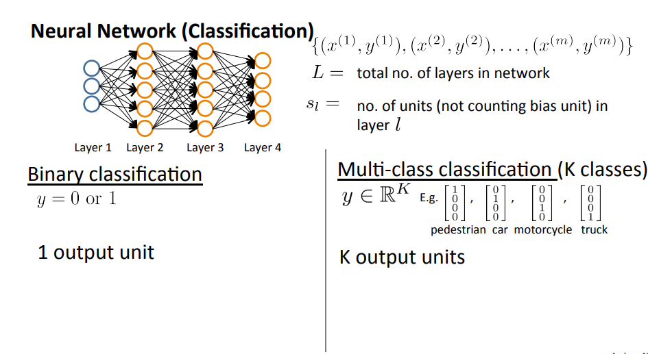 NN에서 K개의 class를 classify하는 multiclass classification이라면 $h_{\theta}(x) \in R^K$즉 K개의 output을 갖게 된다. 따라서 각 class의 output 갯수 만큼 cost 계산시 반복하여 summation에 하면 된다.$$