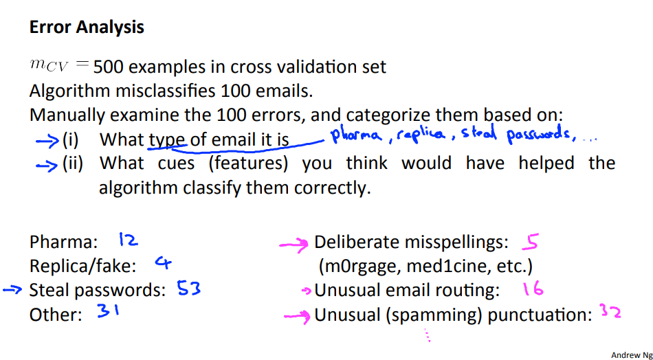 예를 들어, 500개의 이메일이 있는데 알고리즘이 100개의 이메일을 잘못 분류한다고 가정할 때 100개의 이메일을 수동으로 분석하고 그것이 어떤 종류의 이메일인지에 분류할 수 있다. 그러면 우리는 이 100개의 이메일을 정확하게 분류하는 데 도움이 될 새로운 단서와 기능을 생각해 낼 수 있다.