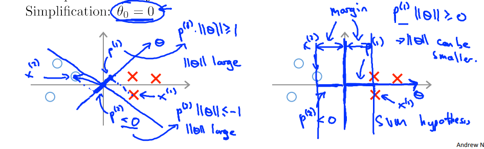 $$ min_{\theta} \frac{1}{2} \sum_{j=1}^{n}\theta_j^2 \\=\frac{1}{2}(\theta_1^2+\theta_2^2)\\=\frac{1}{2}(\sqrt{\theta_1^2+\theta_2^2})^2\\=\frac{1}{2}\lVert \theta \rVert ^2\\st \ \ \theta^Tx^{(i)} \ge1 \ \ \ if \ \ y^{(i)}=1 \\ \ \ \theta^Tx^{(i)} \le -1 \ \ \ if \ \ y^{(i)}=0\\ \Rightarrow \\ p^{(i)} \cdot \lVert \theta \rVert \ge1 \ \ \ if \ \ y^{(i)}=1 \\ \ \ p^{(i)} \cdot \lVert \theta \rVert \le -1 \ \ \ if \ \ y^{(i)}=0\\ $$