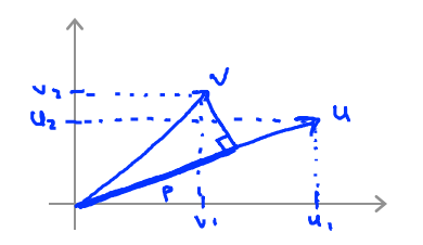 $u^Tv = [u_1 \ u_2]\begin{bmatrix}v_1\\v_2\end{bmatrix}=u_1v_1+u_2v_2=p*\lVert u \rVert$, p는 v를 u 에 정사영 시킨 길이를 나타낸다.