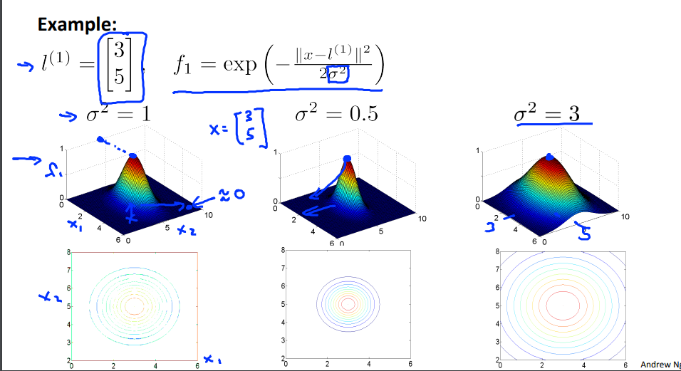 $$ f_1 = similarity(x, l^{(1)}) = exp(- \frac{\lVert x - l^{(1)}\rVert ^2}{2 \sigma^2})\\ If \ \ \ x\approx l^{(1)}:\\f_1 \approx exp(- \frac{0 ^2}{2 \sigma^2})\approx 1\\If \ \ \ x \ \ \ if\ far\ from \ \ l^{(1)}:\\f_1 \approx exp(- \frac{(large \ number)^2}{2 \sigma^2})\approx 0 $$