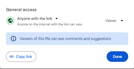 방법은 간단하다. 1. 데이터에 공유 버튼을 누르고 팝업창이 나오면 2.General access 부분을 Anyone with the link로 바꿔주고 링크를 복사하면 된다.